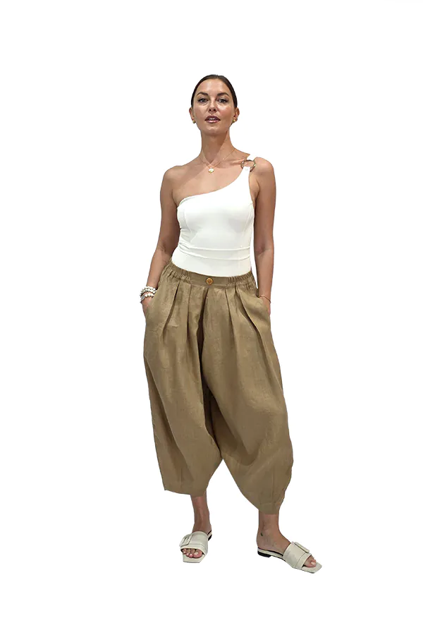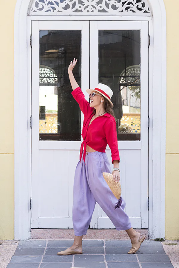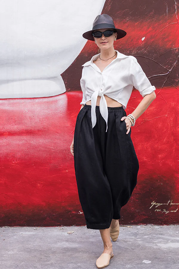 The pleated Betty pants were created with a breezy wide-leg fit that cinches as it reaches the floor, creating the beloved balloon shape. The comfortable elasticated waistband allows the pants to be worn on the waist or the hip. These pants possess the relaxed elegance needed to transition from the beach to casual plans in the city. Pair it with our Melody shirt for a stylish resort look.