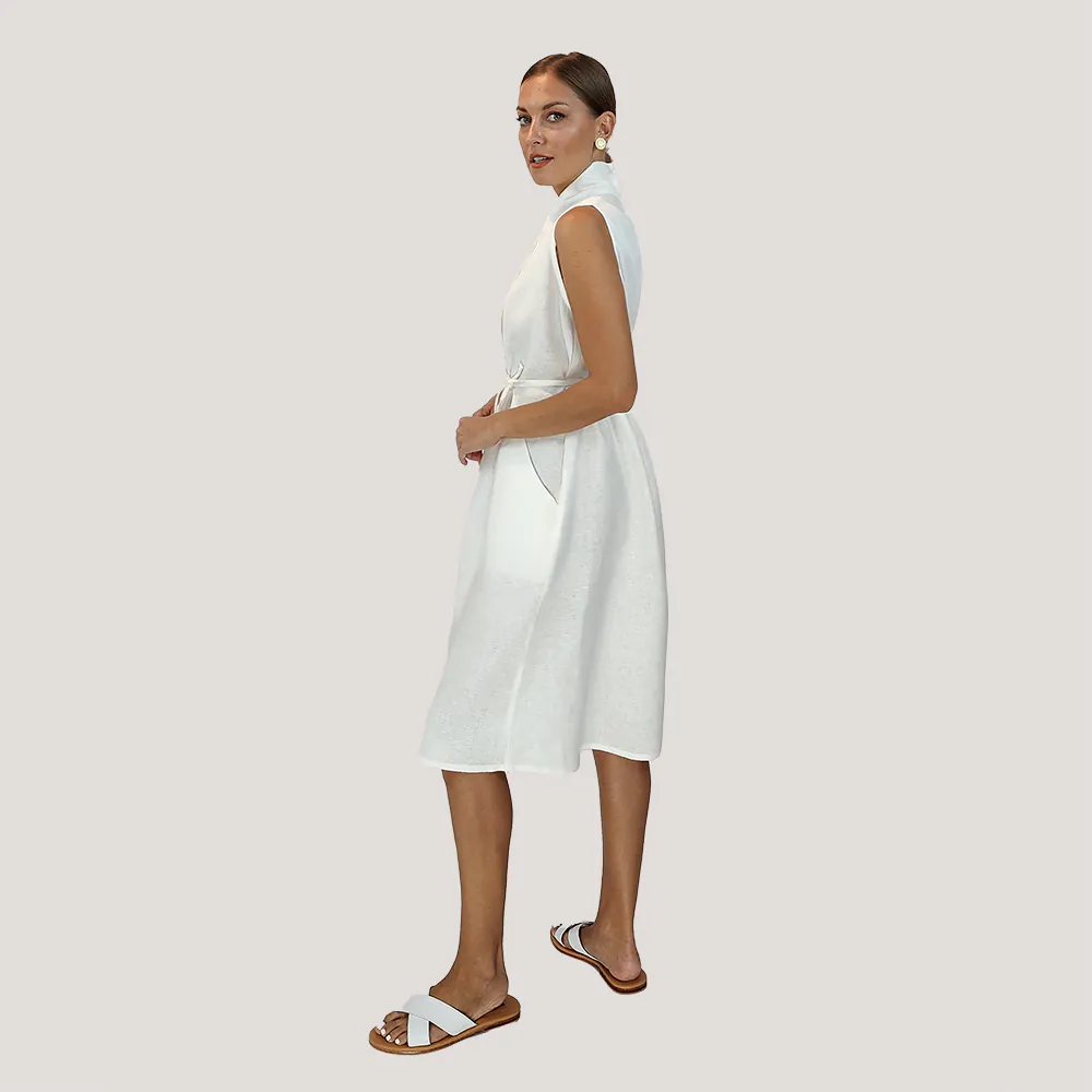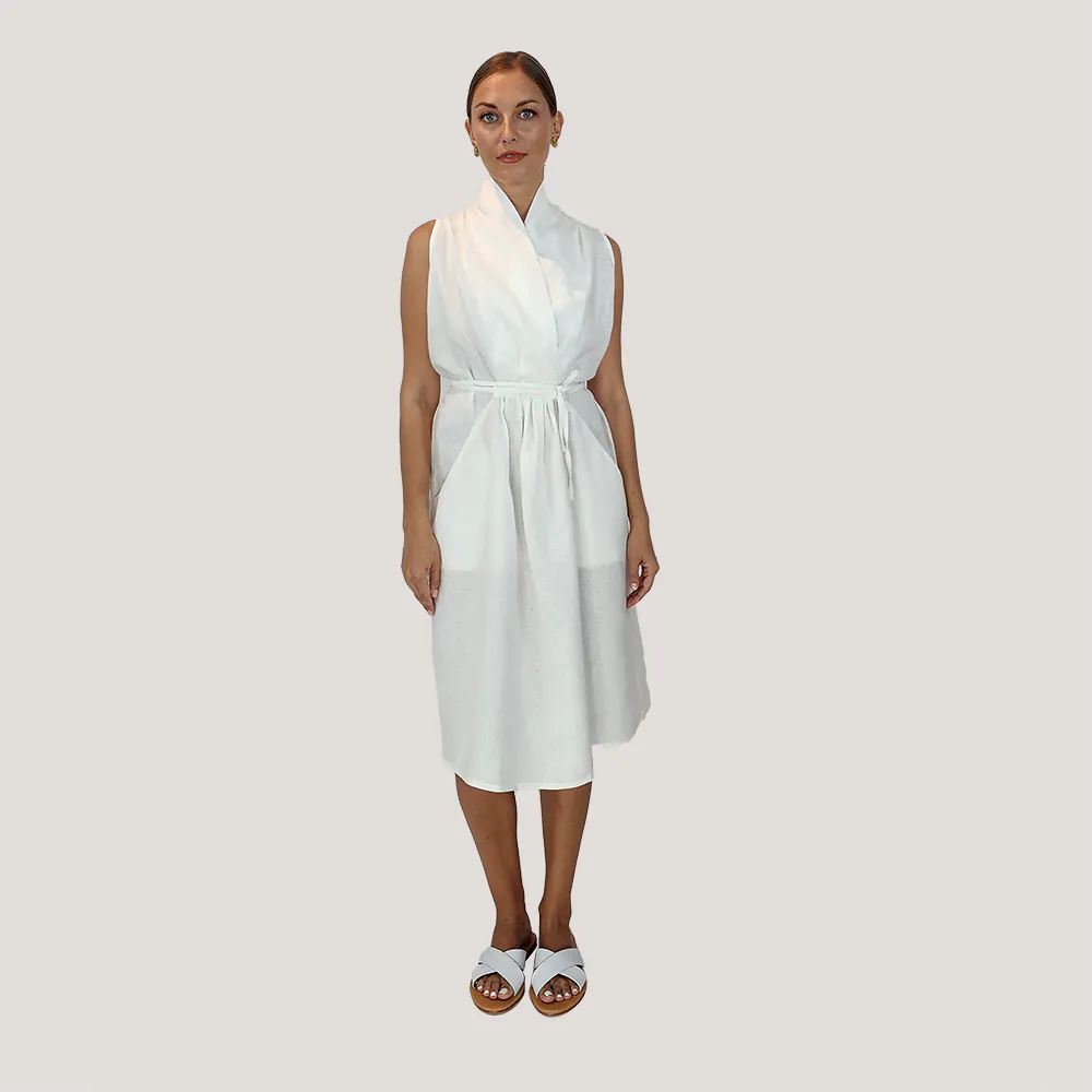 Boasting confidence and style, this sleeveless uniquely designed midi dress features a sensual swan-style shaped collar bringing a playful softness to the overall look. The long drawstring waist offers an adjustable fit and can be fastened on the side or in the front. Vintage inspired front pockets and pleats are undeniably reminiscent of a retro time.