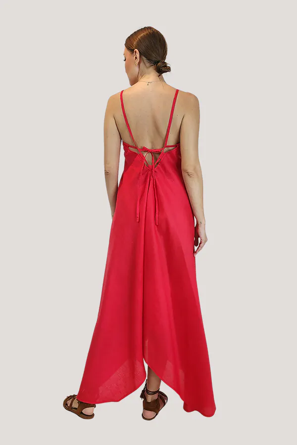 The Lana maxi-dress has so many eye-catching elements. It’s made from breezy linen in a striking red, drapes along your figure with a deep V-neckline and adjustable halter straps to tie on the lower back. The ankle-length asymmetric hem is made for a memorable entrance. Enhance the red shade with ruby earrings.