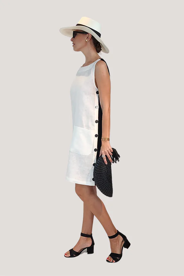 The sleeveless monochromatic Lesley dress is a statement piece with its wooden button’s details on the side, patch pockets and round neck. Accessorize it with the Diana hat and a pair of chunky bracelets.